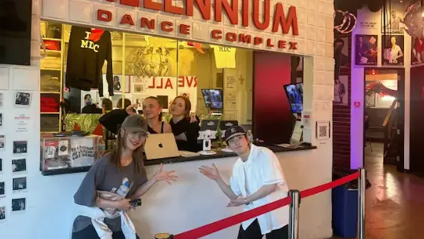 ロサンゼルスのミレニアムダンスコンプレックス受付前で撮影した日本人ダンス留学生の写真